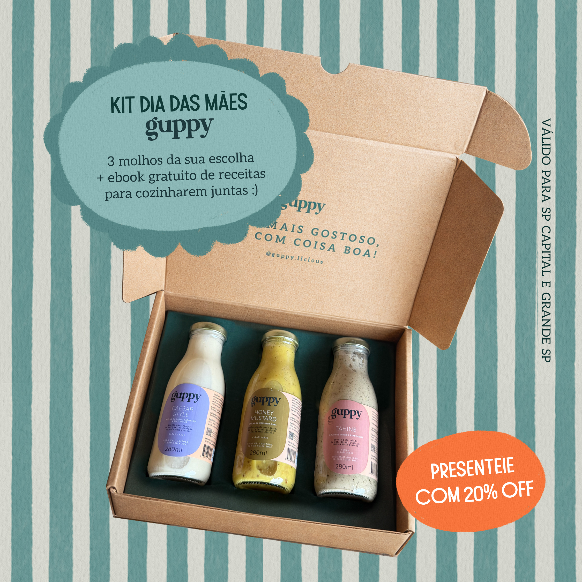 Pensamos nessa caixinha linda, para você montar do seu jeito. Você scolhe os 3 molhos que mais gosta, e, junto ganha um e-book de receitas para cozinhar com a sua mãe <3